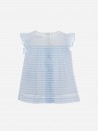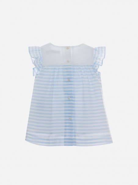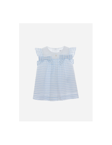 En popeline à rayures bleues. De jolis nœuds et volants assortis embellissent le corsage et les épaules. La robe est ample et froncée.