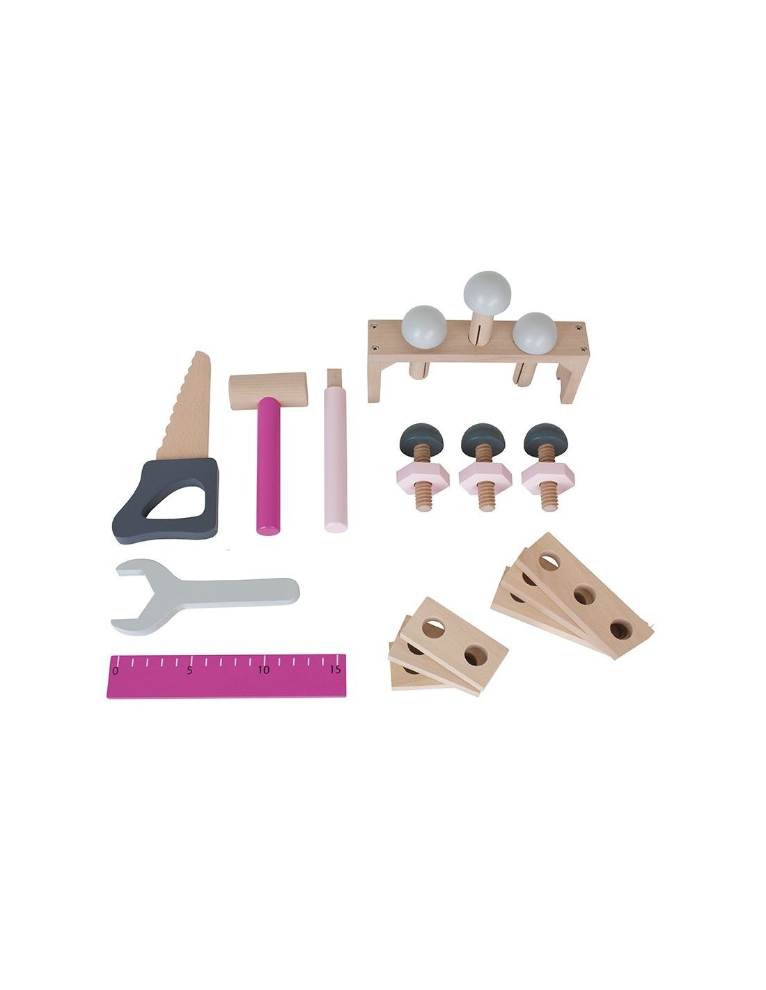 Contiene un totale di 16 parti; 1 cassetta degli attrezzi, 1 righello, 1 chiave inglese, 1 cacciavite, 1 martello, 3 chiodi, 3 viti, 3 dadi e 3 blocchi.