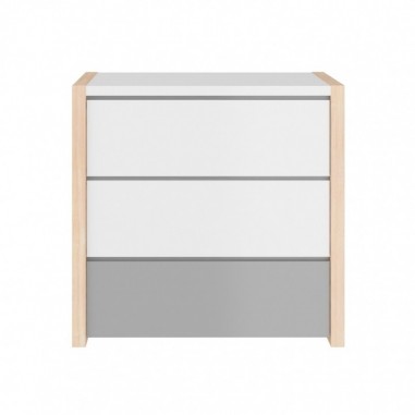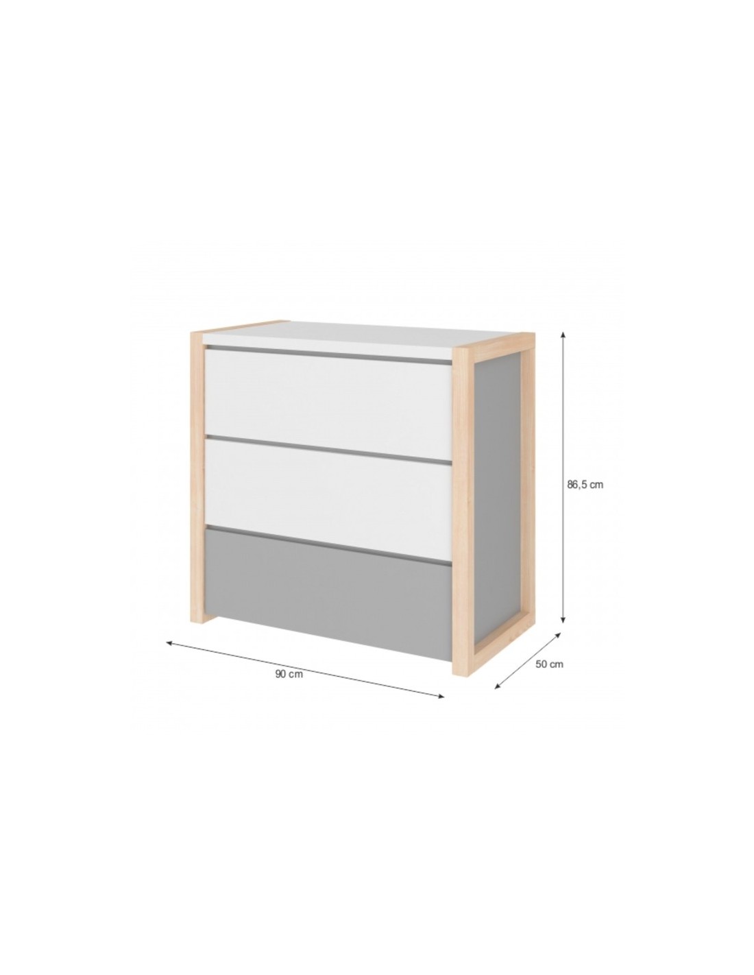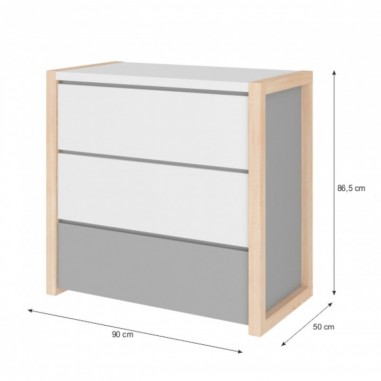 Una cassettiera in legno con un mix di colori grigio, bianco e legno naturale che puoi posizionare nella cameretta di qualsiasi bambino, ragazza o ragazzo.