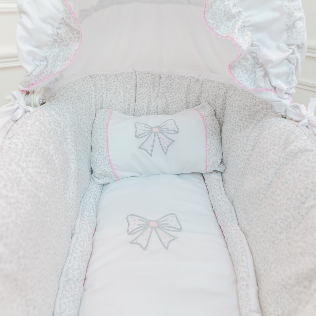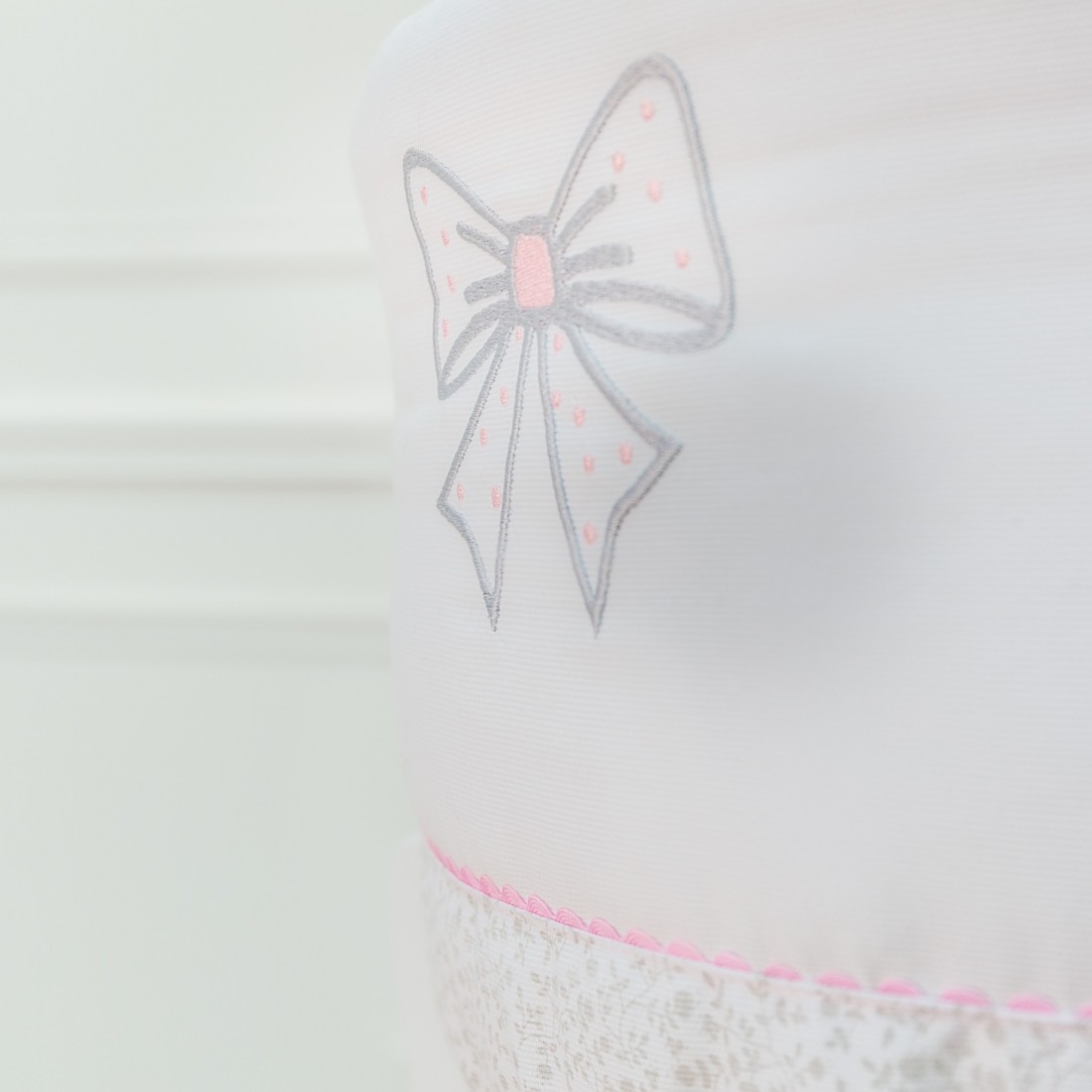 Questa culla proviene dalla collezione "Noeud Couture". La sua particolarità è quella di avere un papillon ricamato sul davanti.