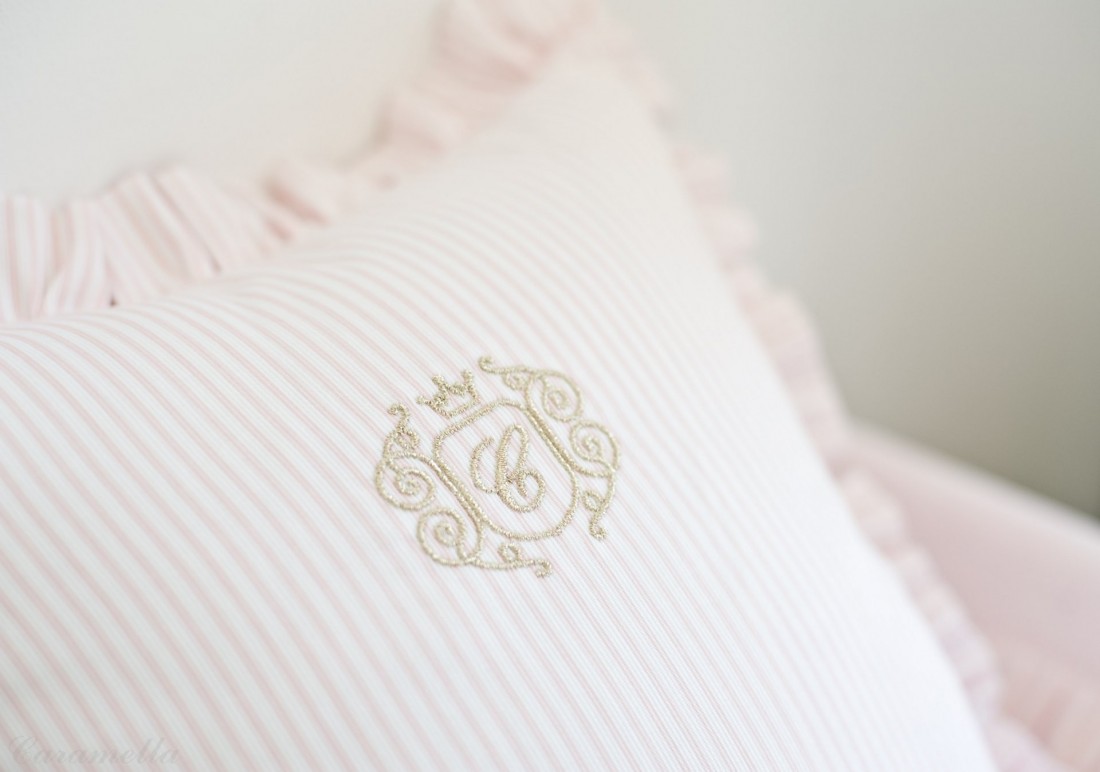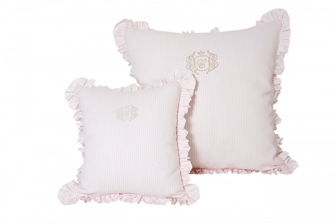 Cuscini rosa decorati con una bellissima volant e un elegante stemma dorato. Realizzato in cotone di alta qualità con strisce rosa-bianche.