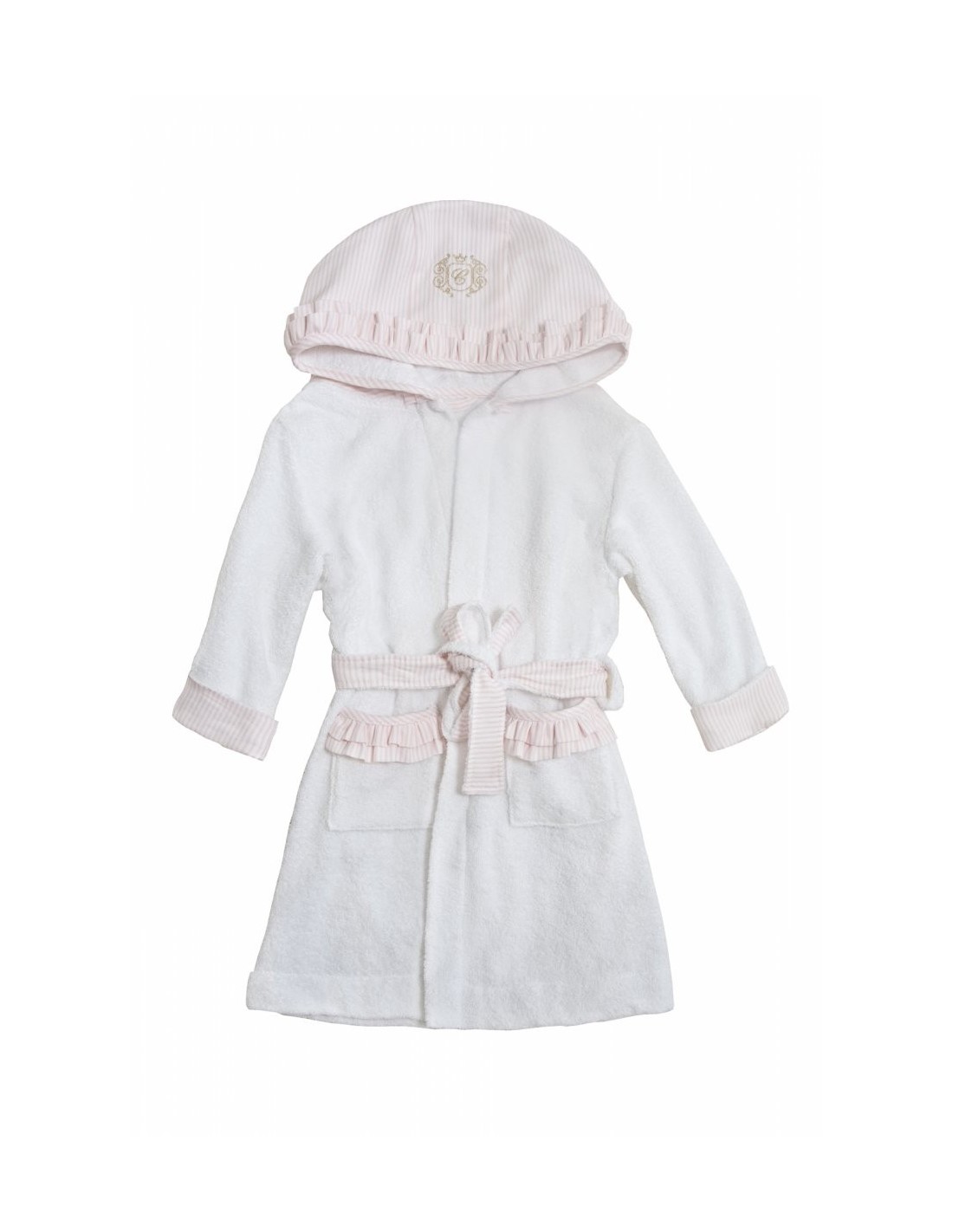 È realizzato con cura, cucito con spugna bianca e inserti in cotone con righe bianche e cipria. Il cappuccio è decorato con un'elegante volant e il suo stemma dorato.