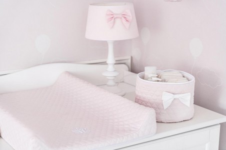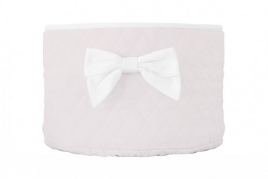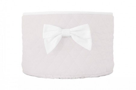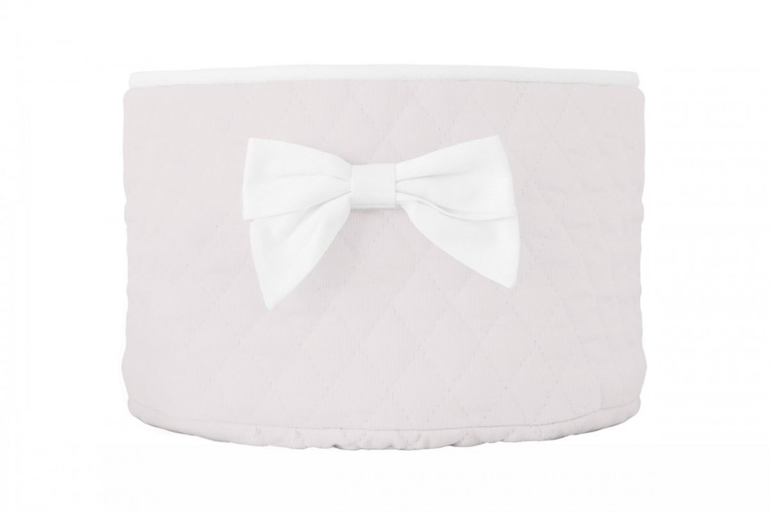 Il suo piccolo cestino rotondo in cotone trapuntato rosa confetto e decorato con un grazioso fiocco. Luogo ideale per riporre gli accessori per bambini.