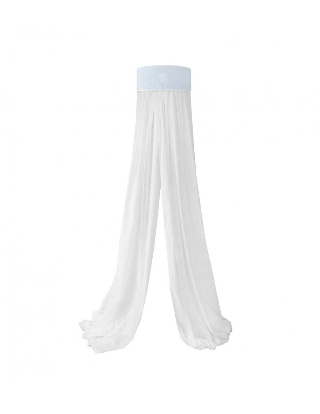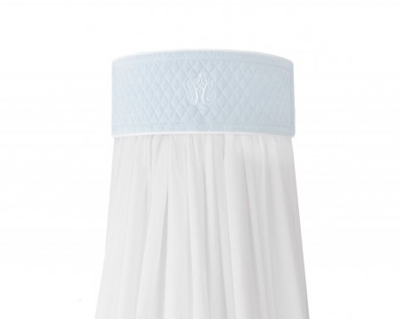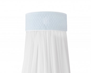 Un bellissimo tetto in vetro per la cameretta dei bambini. Realizzato in cotone bianco satinato e arricchito da un'elegante cornice a semicerchio blu. La bordatura è rivestita in tessuto trapuntato celeste decorato con carrè bianco. Il telaio è stato progettato in modo che i tessuti e la parte decorativa dell'accessorio possano essere facilmente rimossi per il lavaggio.