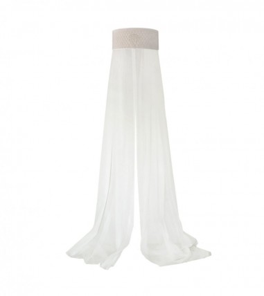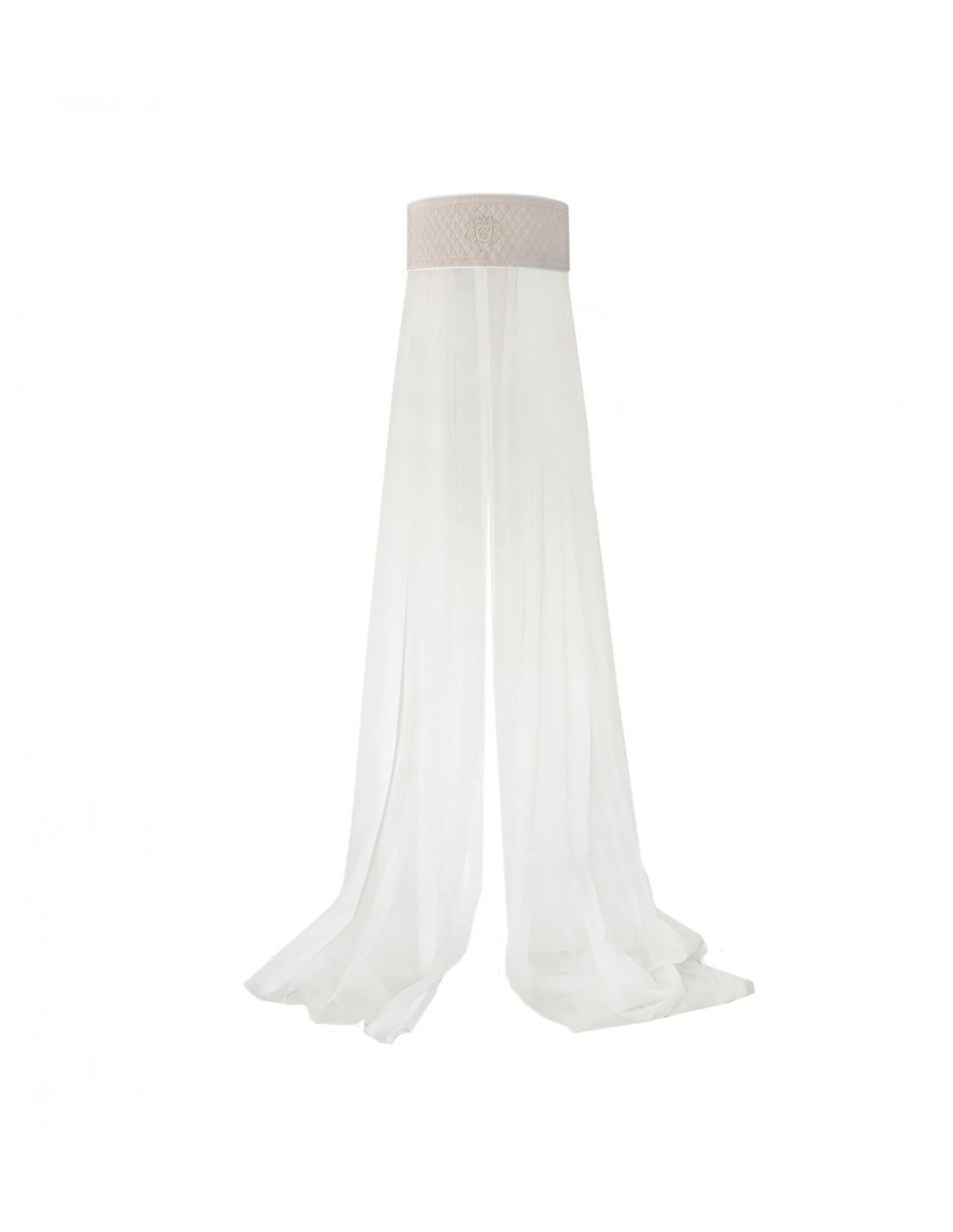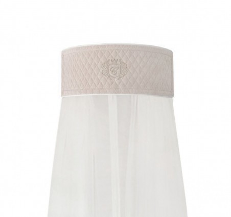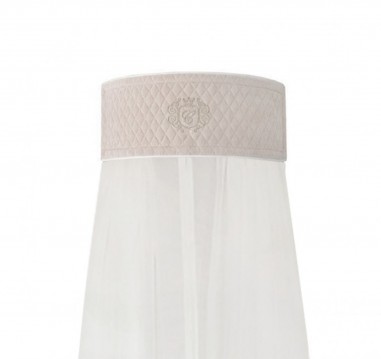 Un bellissimo baldacchino per la cameretta dei bambini. Realizzato in leggero velo trasparente e arricchito da un'elegante cornice a semicerchio beige. La rilegatura è rivestita in velluto trapuntato beige baby rifinito con un carré dorato e decorato con eleganti ricami. Il telaio è stato progettato in modo che i tessuti e la parte decorativa dell'accessorio possano essere facilmente rimossi per il lavaggio.