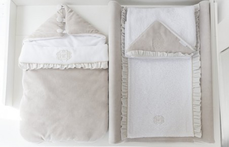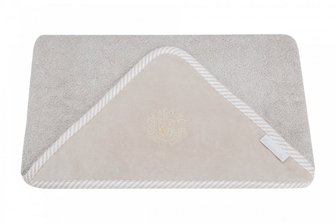 Elegante asciugamano in spugna beige. Il berretto di velluto beige è decorato con un elegante stemma dorato. La dimensione dell'asciugamano è maggiore di quelle generalmente disponibili sul mercato. Può essere utilizzato da un bambino piccolo e da un bambino più grande. Ecco perché lo utilizzerai per molto tempo. Perfetto per un regalo.