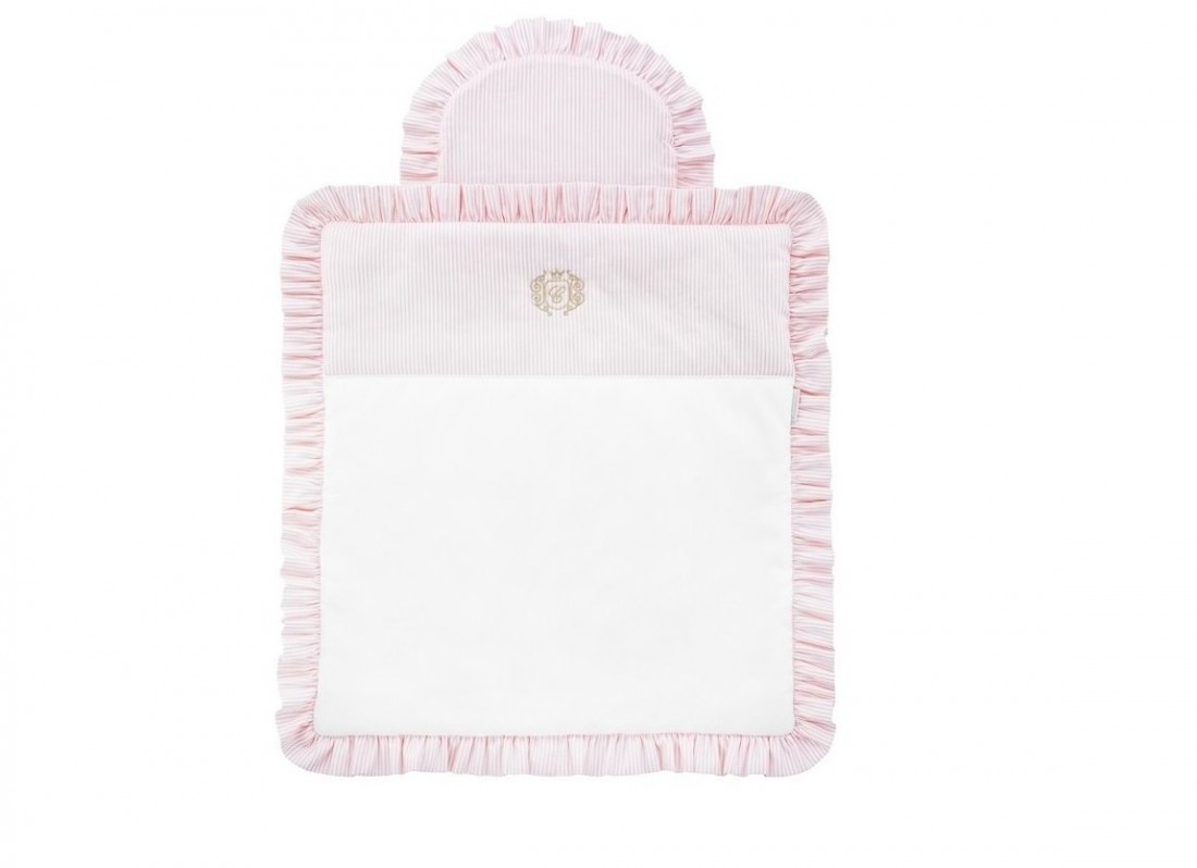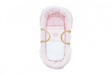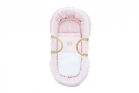 Mini biancheria da letto per la cesta o la culla. Realizzato in raso di cotone bianco e con pannello e cuscino a righe bianco-rosa confetto. Decorato con uno stemma aziendale dorato e rifinito con una graziosa volant. La biancheria da letto ha un'imbottitura.