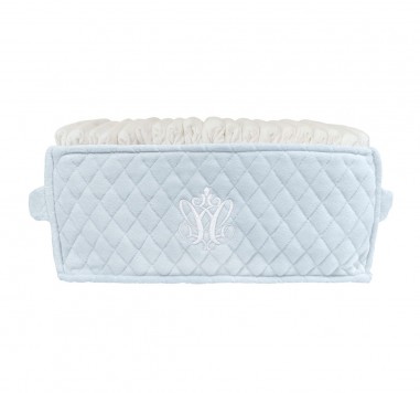 Il suo piccolo cestino rotondo in cotone trapuntato rosa confetto e decorato con un grazioso fiocco. Luogo ideale per riporre gli accessori per bambini.