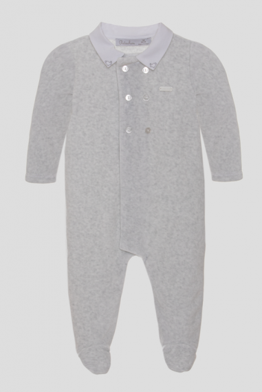 Il pigiama a tutina grigio perla è realizzato in velluto con colletto a camicia bianco.
