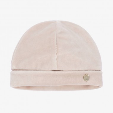 Delizioso cappello rosa per neonata di Paz Rodriguez, realizzato in morbidissimo velluto di cotone con etichetta logo in madreperla sul davanti.