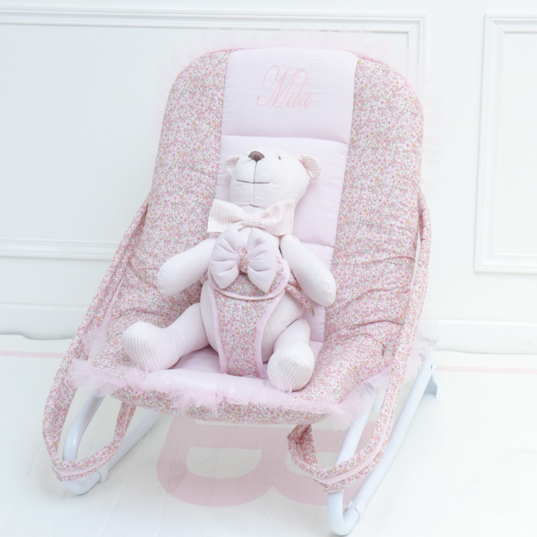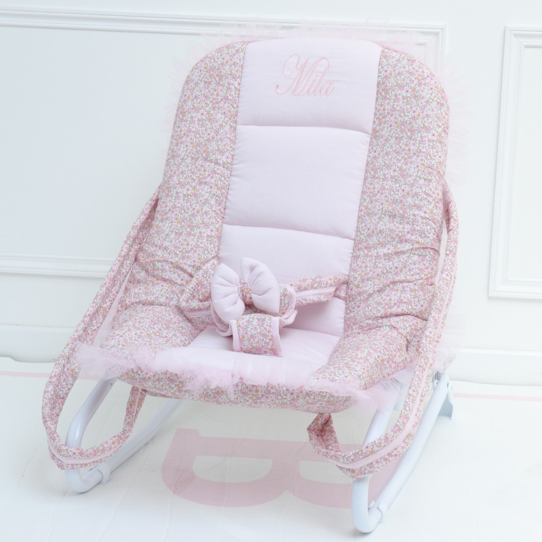 Magnifica sdraio liberty rosa cipria con volant in tulle.