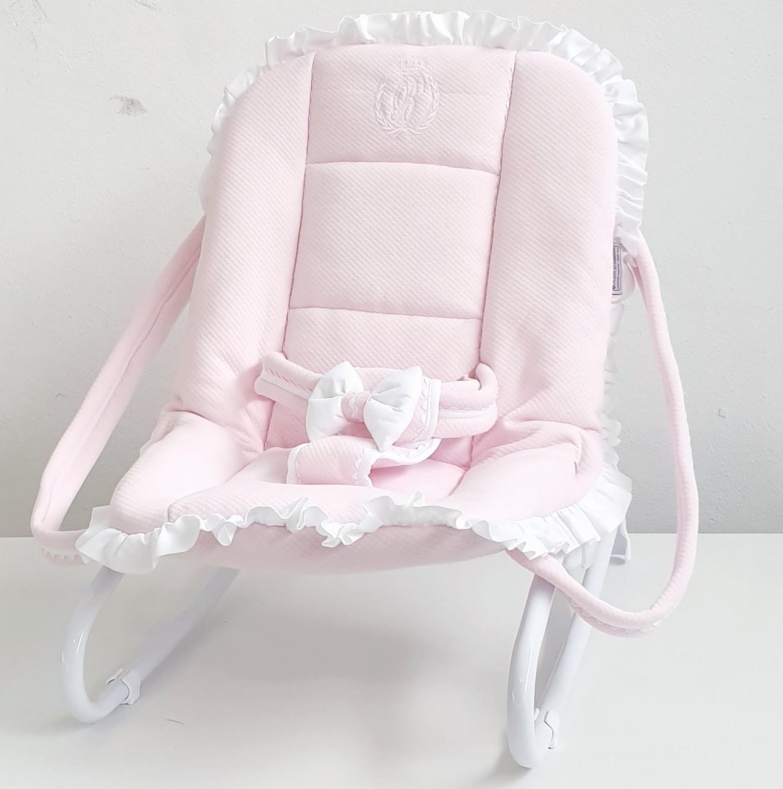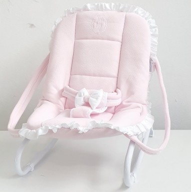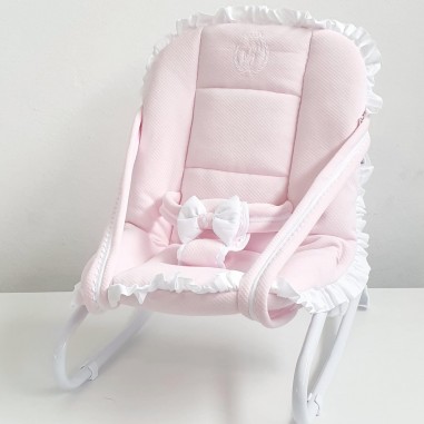 Questo modello è di colore rosa cipria con finiture a treccia serpentina bianca, il tutto valorizzato dal sottile dettaglio del fiocchetto rosa che mantiene il bambino in una posizione stabile.