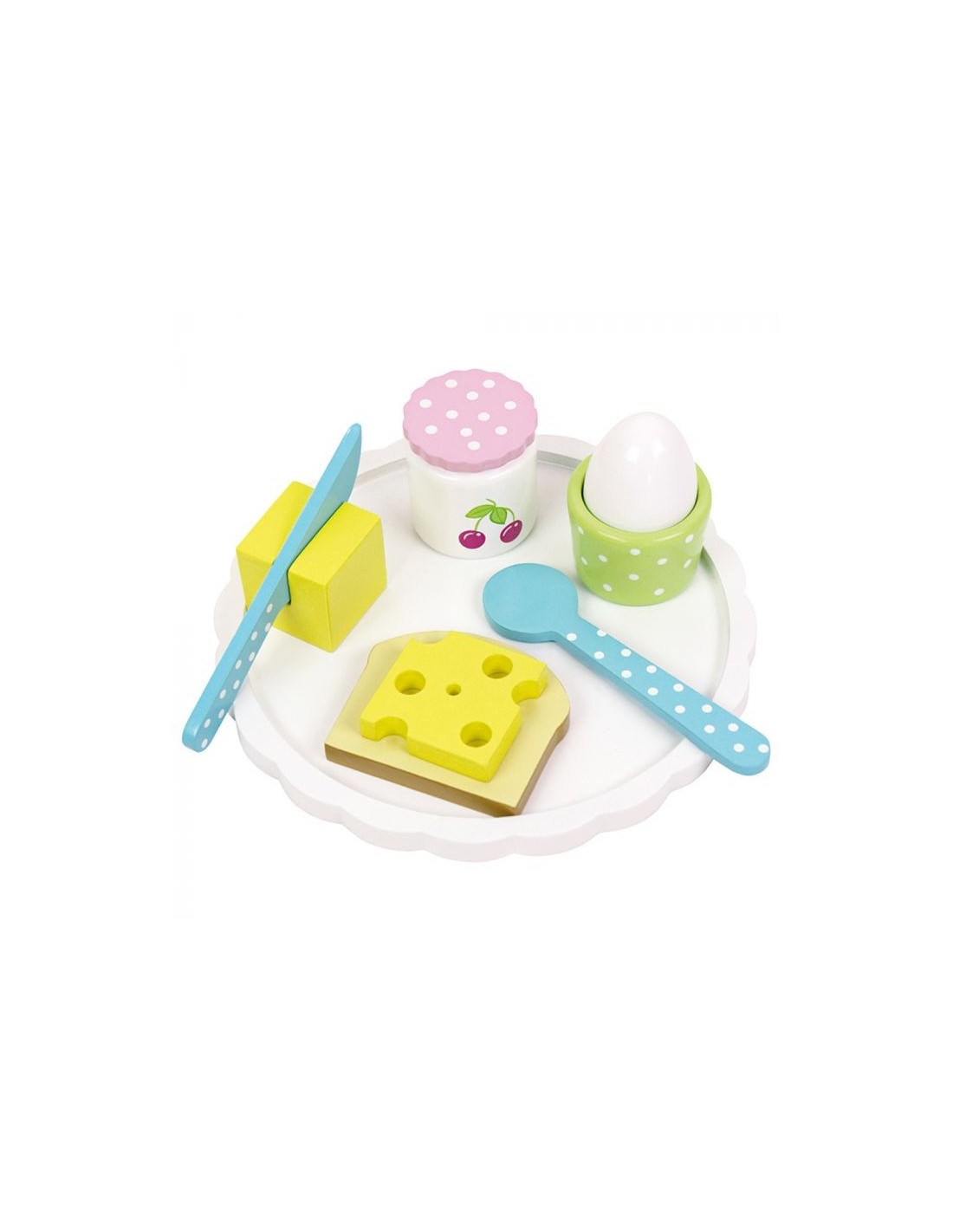 Faca de manteiga e colher incluídas. Tudo é servido em uma travessa branca com bordas onduladas. O conjunto de café da manhã é feito de madeira e vem em uma linda caixa de presente. O conjunto de café da manhã contém 1 travessa e 1 faca. 1 colher, 1 fatia de queijo, 1 sanduíche, 1 barra de manteiga, 1 pote de geléia, 1 ovo, 1 copinho de ovo.