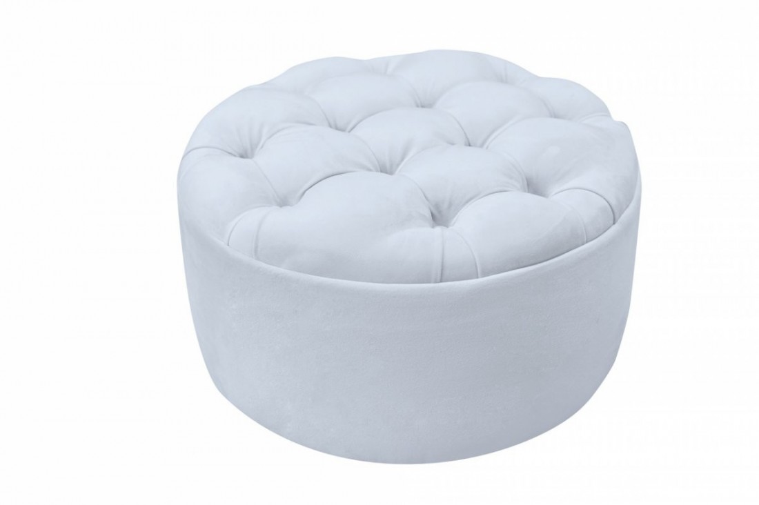 Um elegante pufe acolchoado estilo Chesterfield em tecido lavável de alta qualidade em azul. Um lindo móvel para quarto de criança, quarto ou sala.