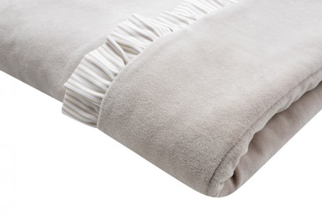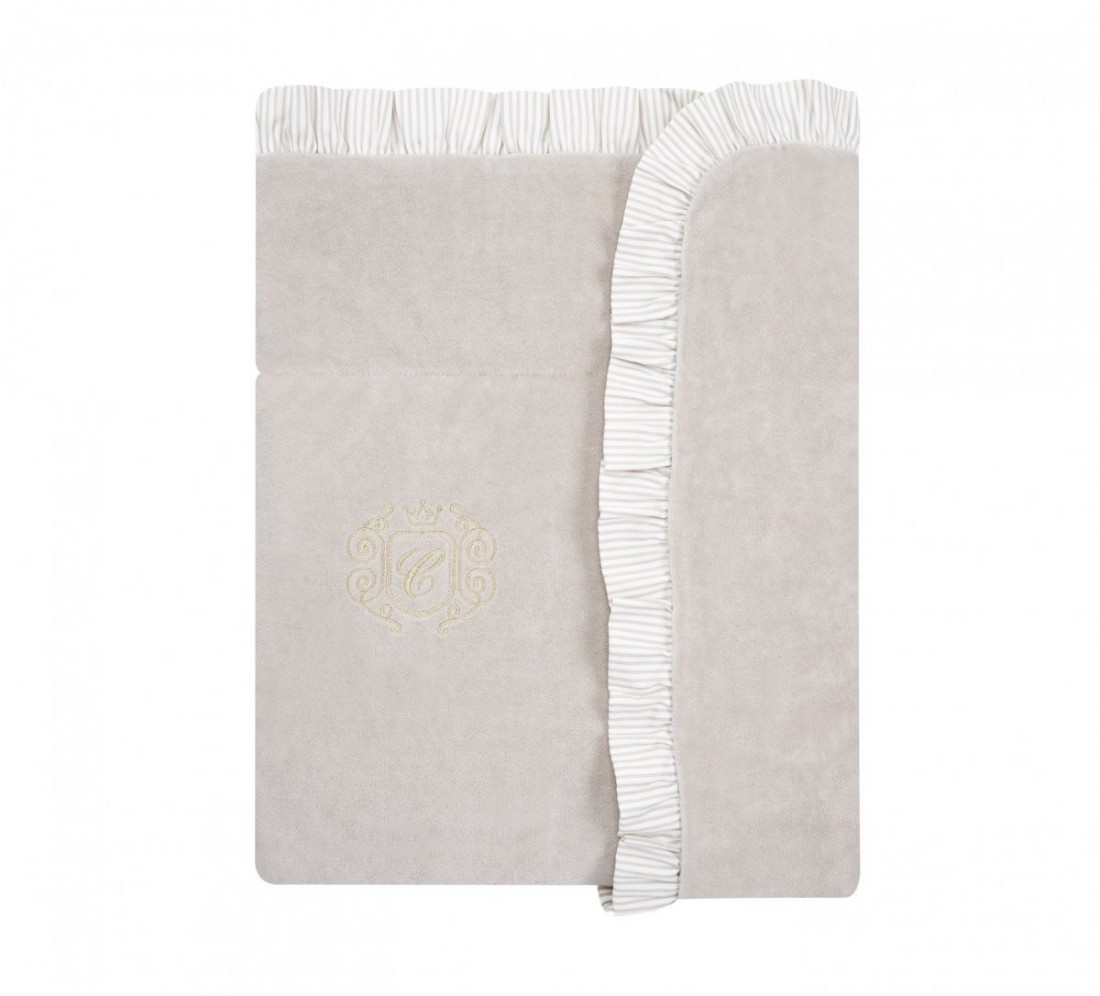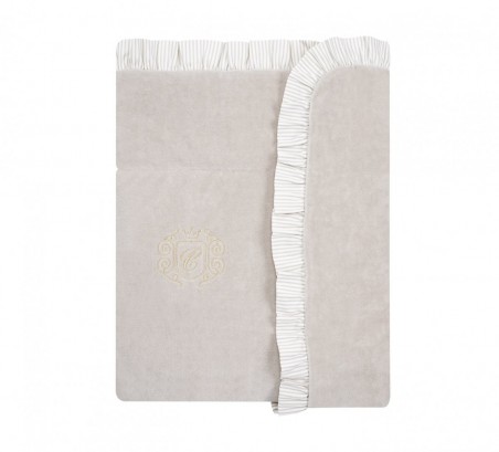 Manta aconchegante em veludo macio na cor bege areia. Decorado com emblema dourado da empresa. A manta será perfeita como presente.