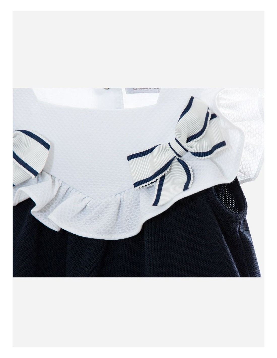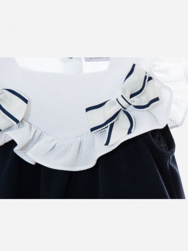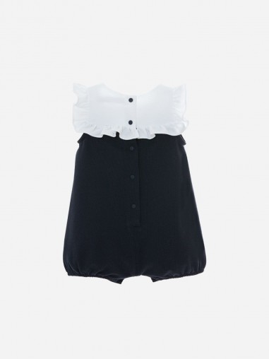 Esse macacão super lindo é em piquet azul marinho. É decorado com um babado em piquê branco no peito e dois lindos laços combinando. O macacão fecha com botões de pressão entre as pernas e nas costas para facilitar a colocação.