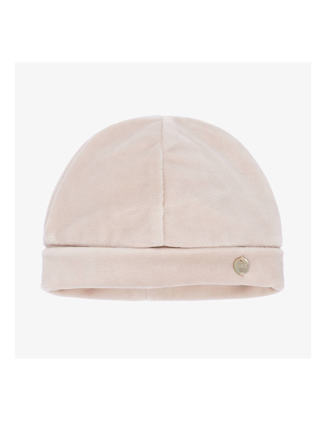 Lindo chapéu rosa para meninas da Paz Rodriguez, feito de veludo de algodão muito macio com etiqueta com logotipo em madrepérola na frente.
